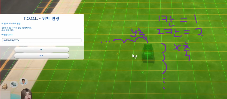 X축과 y축으로 이동 기능입니다. 네모칸 1칸에 숫자 1입니다. 1,1 이라고입력하면 x축으로 1칸y축으로 1칸 움직입니다.