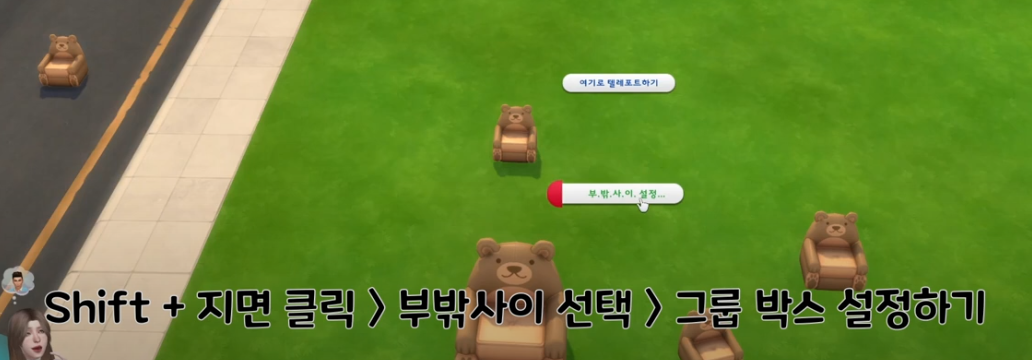 그러면 그룹 박스 안에 있는것이 모두 선택이 됩니다. 이후 크기 변경, 위치 변경 회전을 하고 싶다 하시면 그룹이 된 사물 하나를 shift 누르고 클릭합니다. 부밖사이 모드를 켜서 변경하시면됩니다. 그룹 활성화 해지를 하고 싶은면 그룹 활성 버튼을 한번더 누르면 됩니다. 또한 그룹중 하나만 해지하고 싶은면 alt누르고 그 사물만 선택하면 활성화를 해지할 수 있습니다. 사실 그룹 박스를 지정하지 않아도 alt누르고 사물을 누르면 그룹으로 지정하고 풀고 가능합니다.